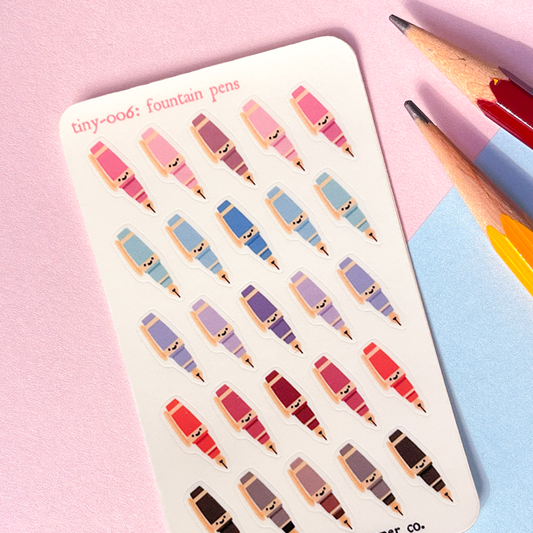 006 Fountain Pens | Mini Planner Sticker Sheet | Tiny Colourful Rainbow Icon Credit Card Sized Bullet Journal Tracker Micro Miniature Seals