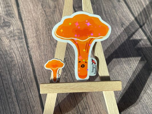 Golden Chanterelle Mushroom Sticker | Holographic Set of 1 Big & 1 Mini Shiny Stickers | Mycology Fungi Biologist Gifts Ecology Nature