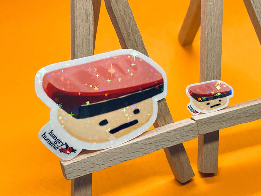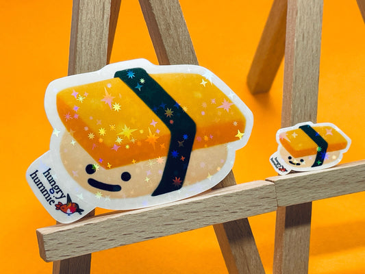 Tamago Sushi Sticker | Holographic Egg Nigiri Set of 1 Big & 1 Mini Stickers | Funny Foodie Gift | Sparkly Cute Kawaii Food Sadface Deco