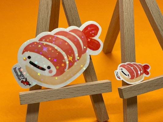 Ebi Blushing Nigiri | Holographic Sushi Sticker Set of 1 Big, 1 Mini Stickers | Holo Stars | Sparkle Cute Kawaii Sadface Food | Prawn Shrimp